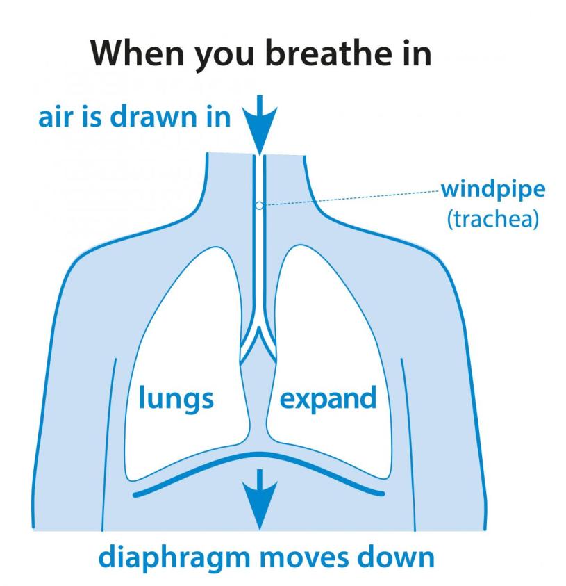 Signals from the respiratory centre in your brain travel down nerves to your diaphragm and other muscles. The diaphragm is pulled flat, pushing out the lower ribcage and abdomen. At the same time, the muscles between your ribs pull your rib cage up and out. This expands the chest and draws air into the lungs.